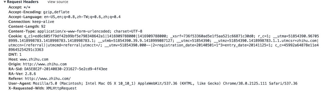 headers = { "Accept": "*/*", "Accept-Encoding": "gzip,deflate", "Accept-Language": "en-US,en;q=0.8,zh-TW;q=0.6,zh;q=0.4", "Connection": "keep-alive", "Content-Type":" application/x-www-form-urlencoded; charset=UTF-8", "User-Agent": "Mozilla/5.0 (Macintosh; Intel Mac OS X 10_10_1) AppleWebKit/537.36 (KHTML, like Gecko) Chrome/38.0.2125.111 Safari/537.36", "Referer": "http://www.zhihu.com/" }